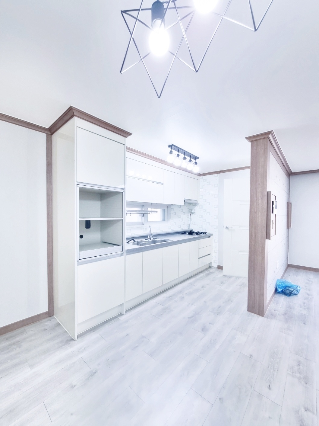 ◑ 주방구조는 안쪽에 있으며 수납공간이랑 전자렌지 밥통수납이 있어 편해요